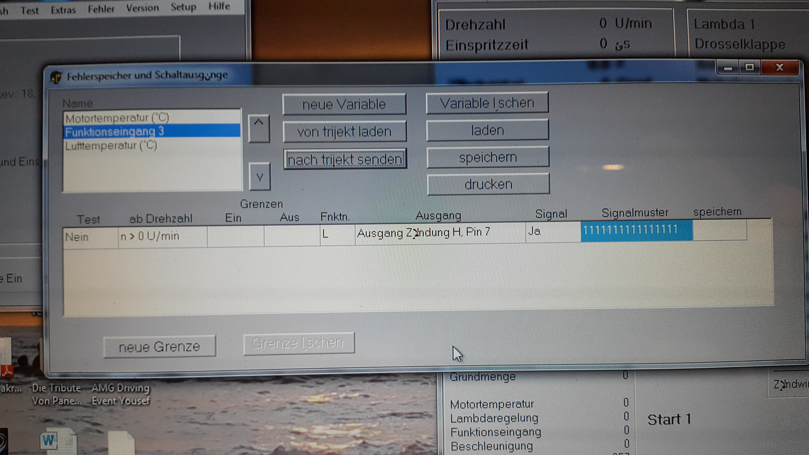Es sollte so funktionieren, dass die Trijekt fuer die Dauer an dem an Funktionseingang2 Masse angelegt wird die Zuendung um 5Grad zurueckgenommen wird (richtung spaet) ab einer Motordrehzahl ueber 2500 U/min und einem Drosselklappenwinkel ueber 60Grad (z.B.)